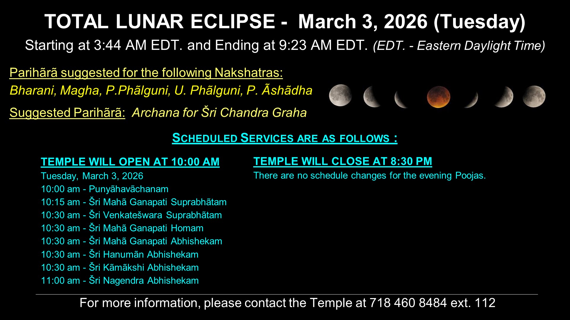 Temple Hours : Weekdays: 8:00 am to 8:30 pm · Weekends: 7:30 am to 8:30 pm