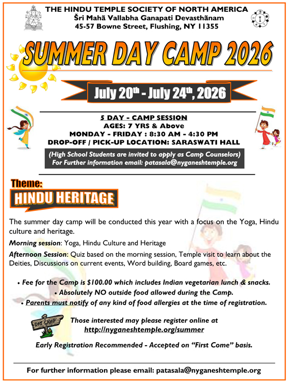 • Theme: Hindu Heritage – The summer day camp will be conducted with a focus on Yoga, Hindu Culture & Heritage.